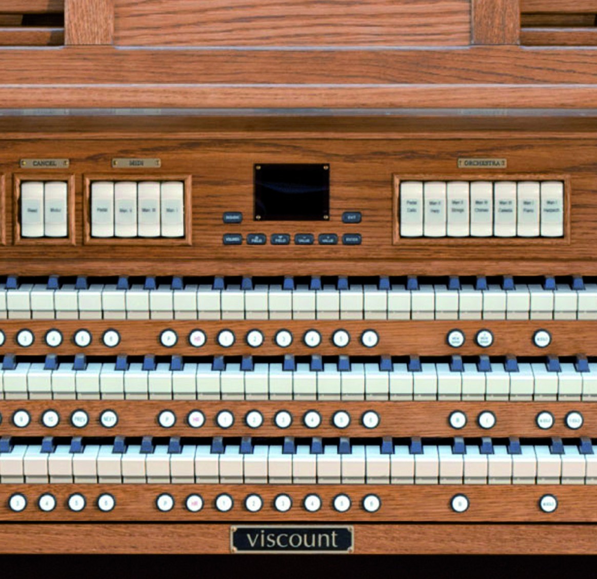 有声音栓总计:56个常规音栓 + 7个管弦乐音色音栓,每个音栓都可以在内置系统音色样本库中替换不同的声音样本。
