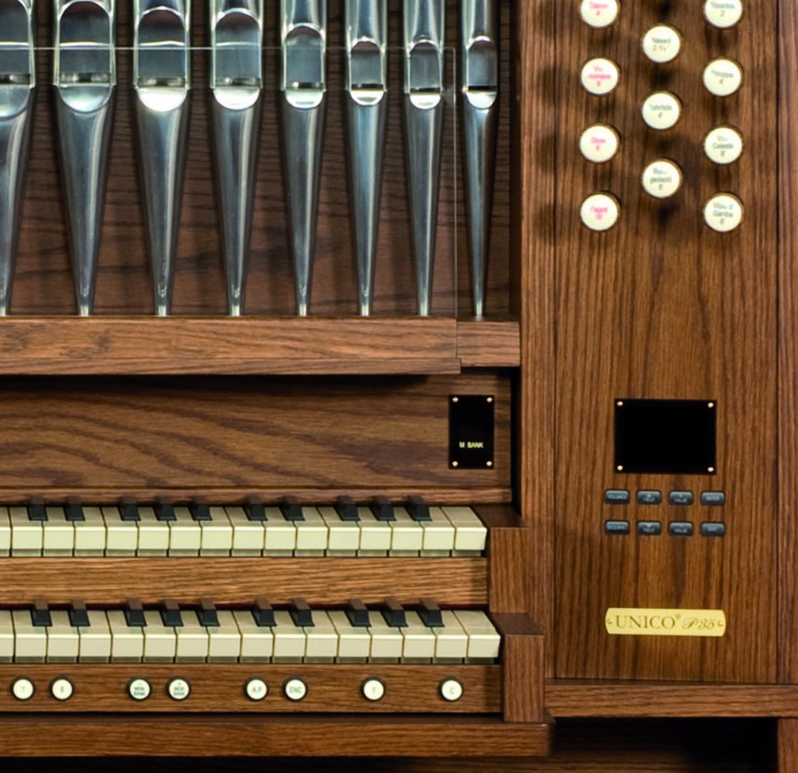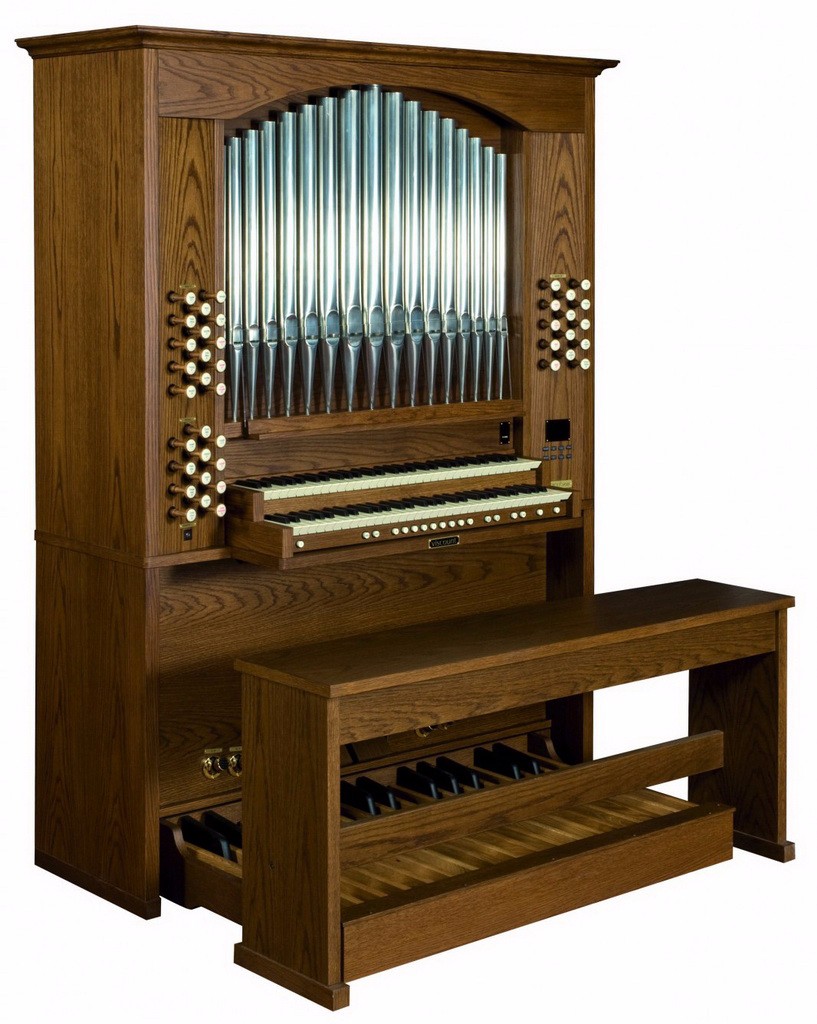 ![]() | 音栓与音色 脚键盘(Pedal):10个 主键盘(Great/Hauptwerk):13个 强弱音键盘(Swell/Schwellwerk/Oberwerk):12个 有声音栓总计:35个常规音栓。 声音风格:4个锁定音色库(巴洛克、浪漫派、英国古典、现代交响)+ 4个可编辑的相同音色库;可在内置系统声音风格选项中进行选择切换,并可以将设置状态存储在内置或外置存储器中。 常规音栓样本替换:每个音栓都可以选择替换不同的声音样本。 全局音色状态快捷按钮:8个 存储记忆库:16个 总存储量:128个全局状态存储。可将上万个音色设置状态存储于内置或外置存储器中。 脚踢顺序快捷按钮:预置存储区的前进与后退切换。 |