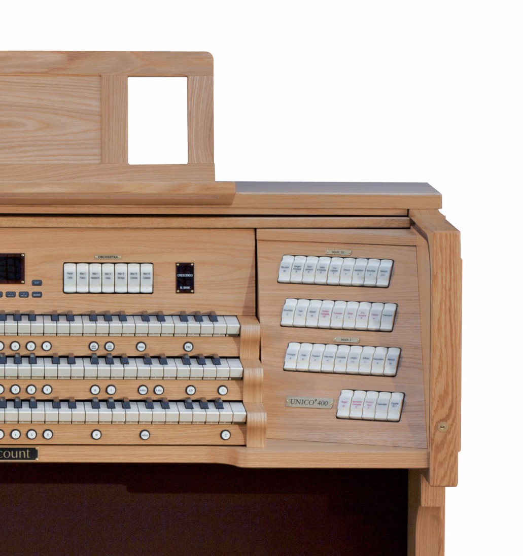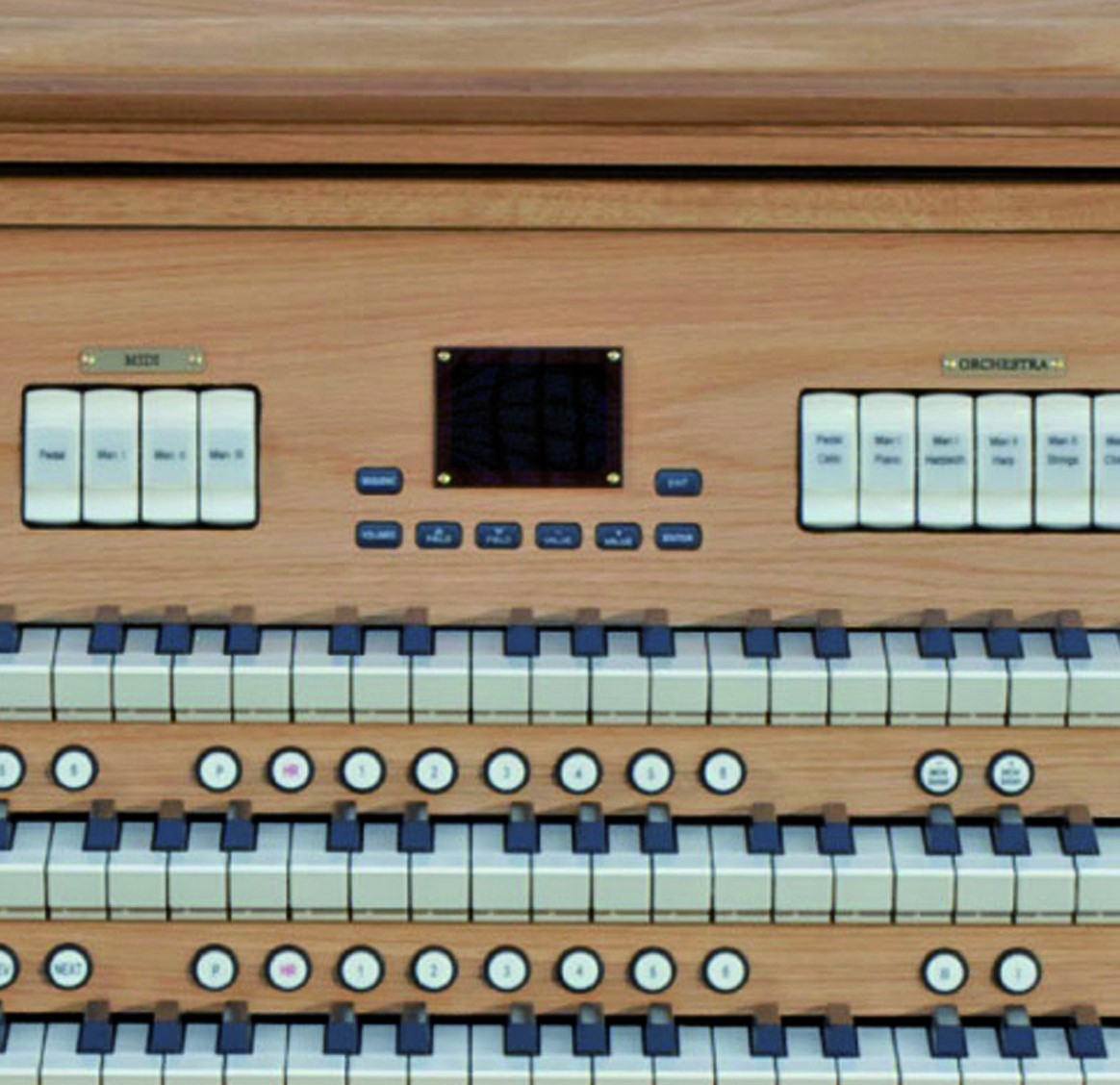 有声音栓总计:56个常规音栓 + 7个管弦乐音色音栓,每个音栓都可以在内置系统音色样本库中替换不同的声音样本。